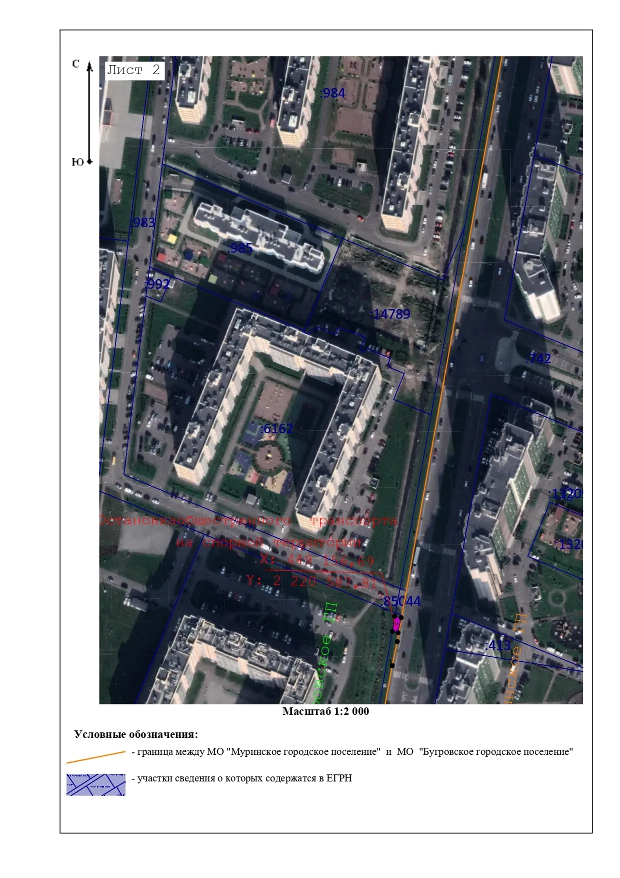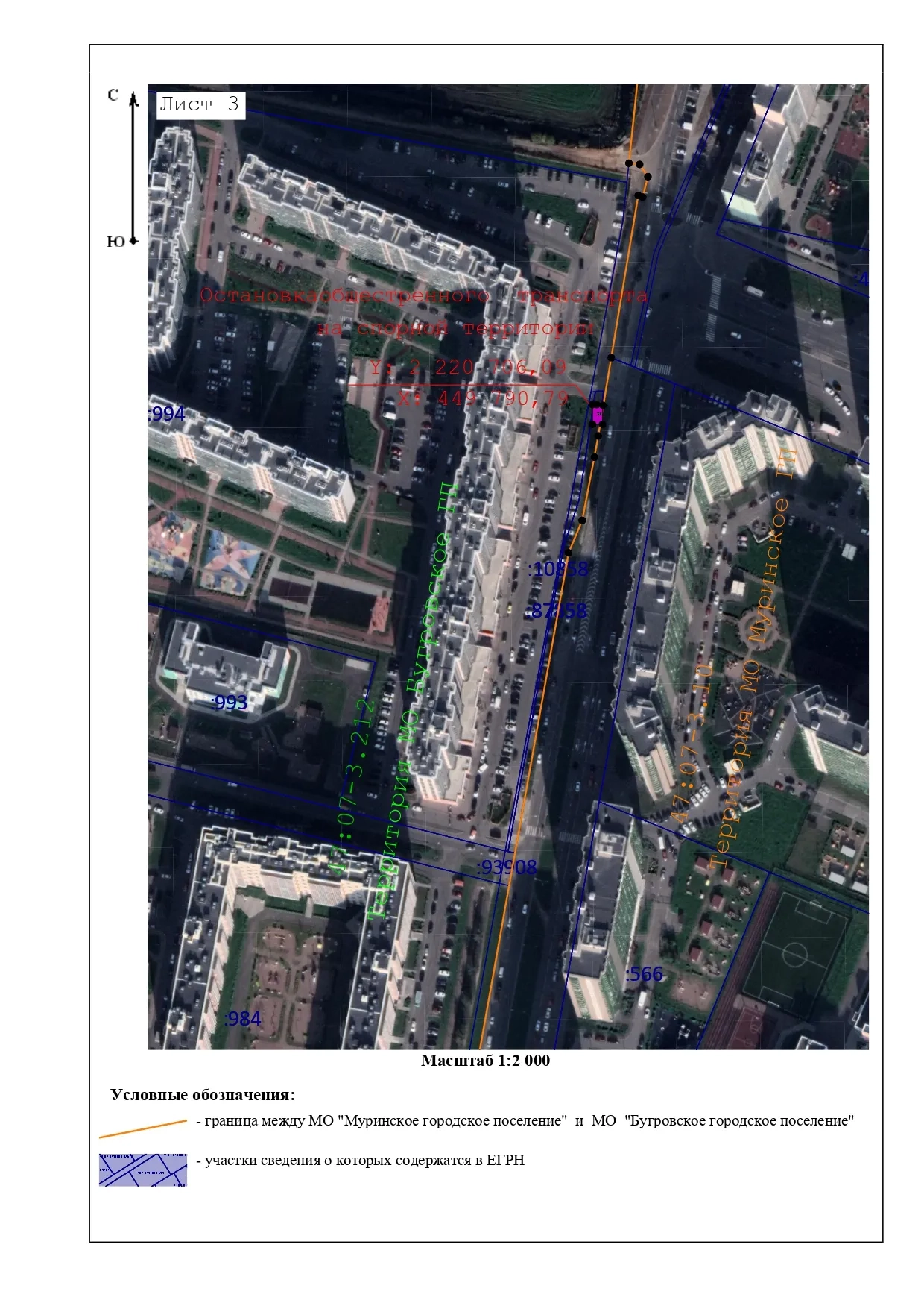 Из материалов по выносу в натуру поворотных точек границы муниципального образования «Муринское городское поселение» смежной с границей муниципального образования «Бугровское городское поселение» Всеволожского муниципального района Ленинградской области, указанный пешеходный проход и остановочные пункты расположены за границей МО «Муринское городское поселение» Всеволожского муниципального района Ленинградской области.