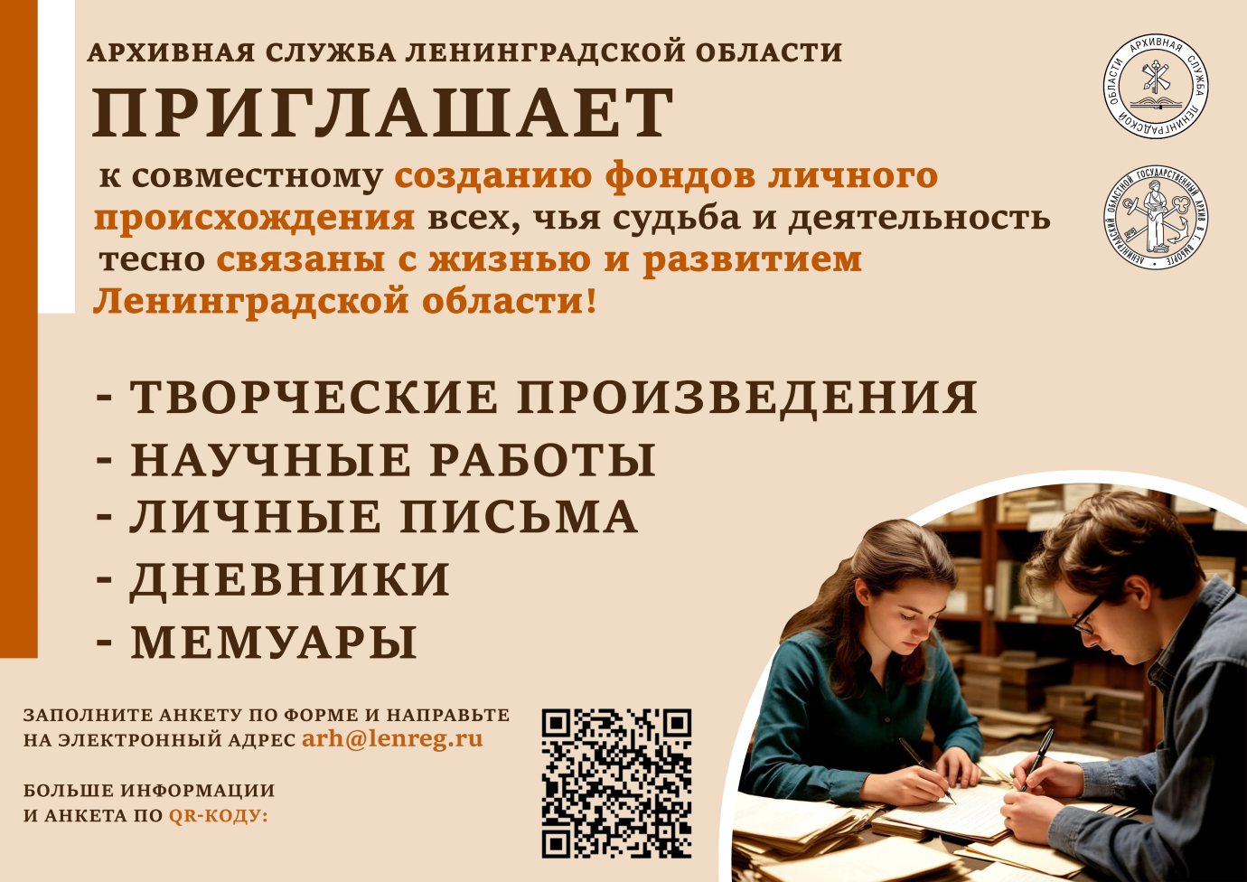 Архивное управление Ленинградской области и Ленинградский областной государственный архив в г. Выборге приглашают к совместной работе по созданию фондов личного происхождения всех, чья судьба и деятельность тесно связаны с жизнью, развитием и достижениями Ленинградской области, а также тех, кто работал на благо России в разных ее уголках и сегодня проживает в нашем регионе.