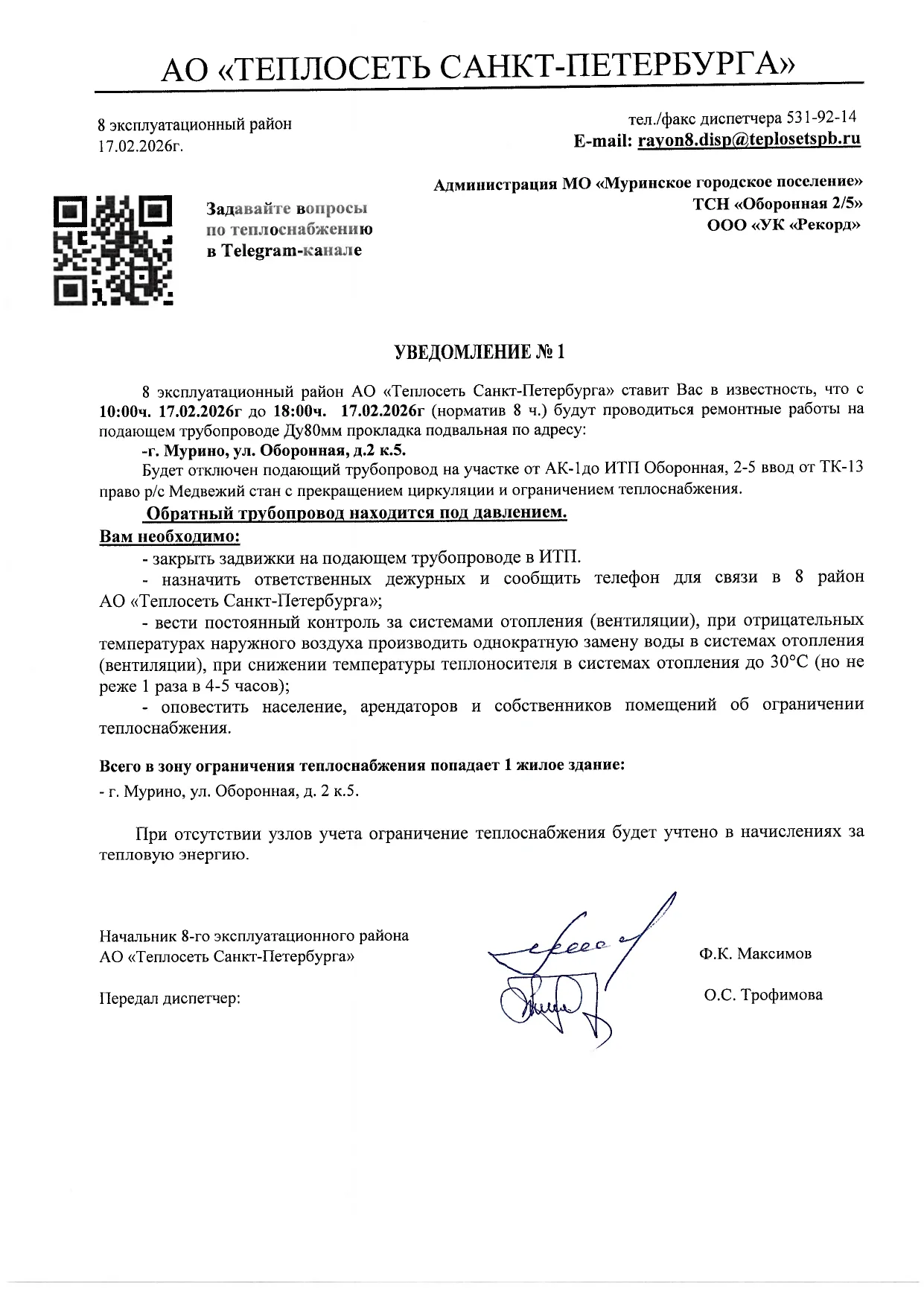 Об ограничении теплоснабжения 17 февраля по ул. Оборонная, д. 2, к.5