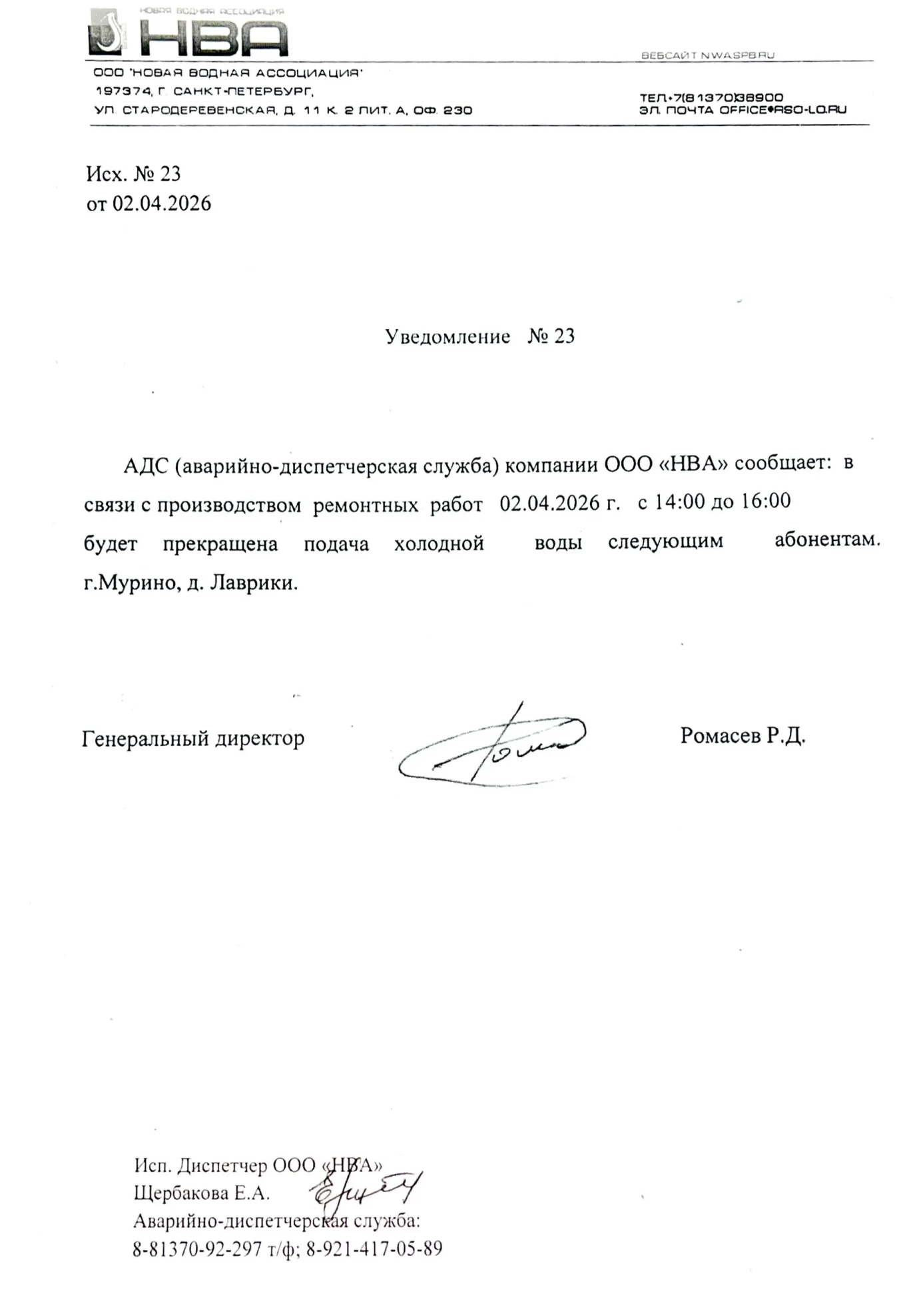 Вниманию жителей д. Лаврики: об отключении ХВС 2 апреля 2026 года