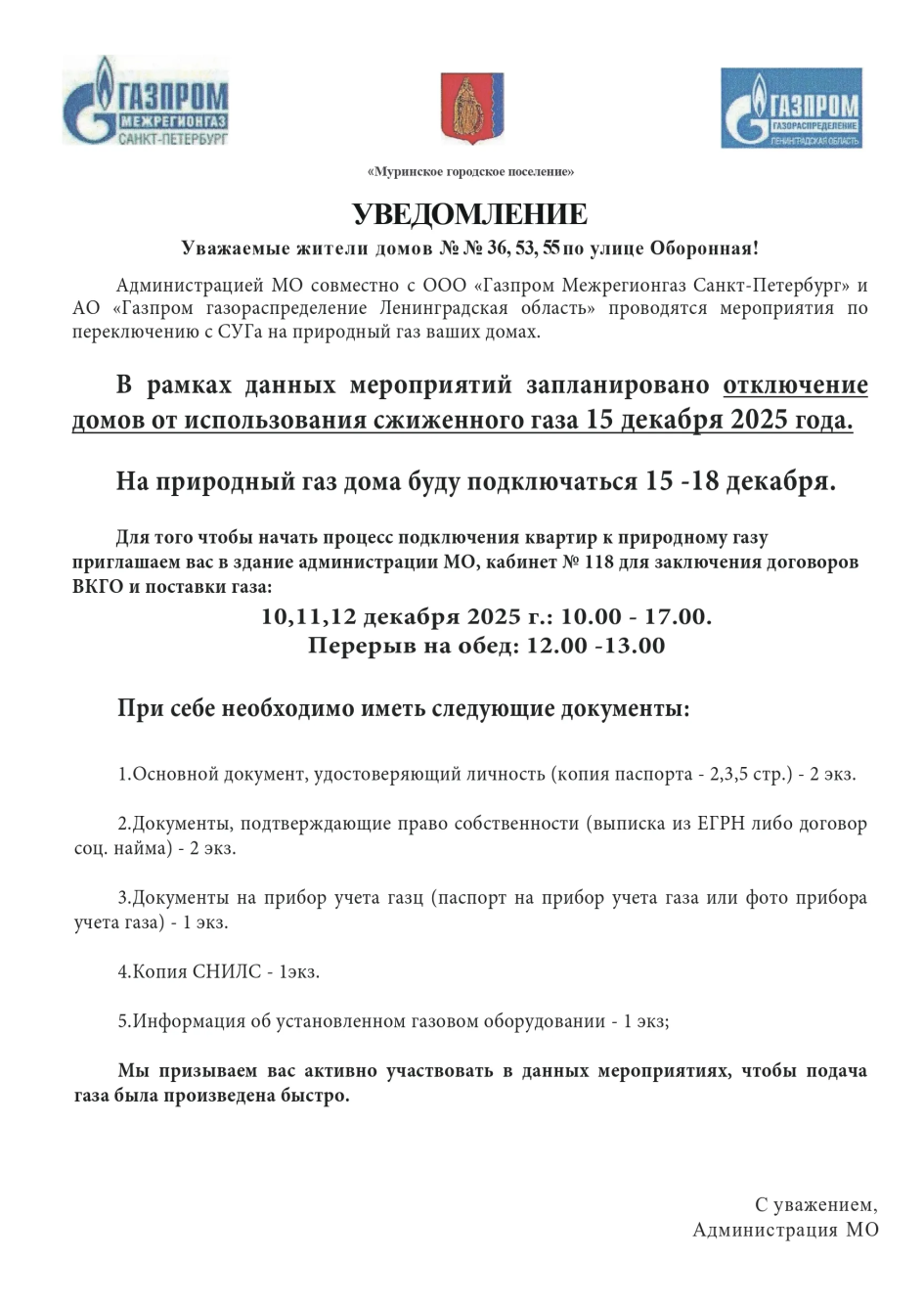 С 9 по 15 октября 2025 года в здании администрации представители «Газпром Межрегионгаз Санкт-Петербург» и АО «Газпром газораспределение Ленинградская область» принимали от жителей документы на заключение договора на обслуживание внутриквартирного газового оборудования и договора на поставку газа, о чем жильцы были заранее информированы – уведомления были разложены по почтовым ящикам, а также размещены на информационных стендах домов.