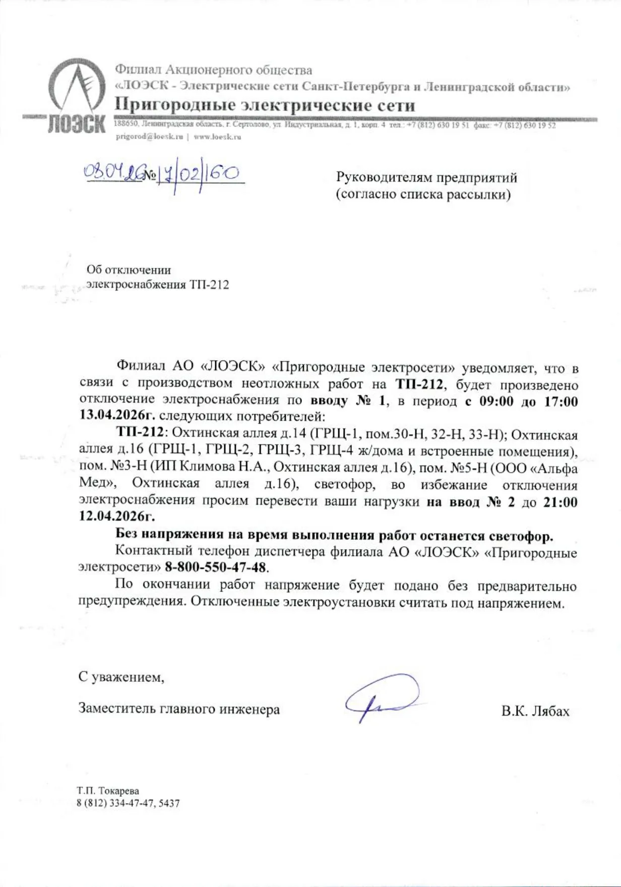 Вниманию жителей: отключение электроснабжения 13 апреля 2026 года