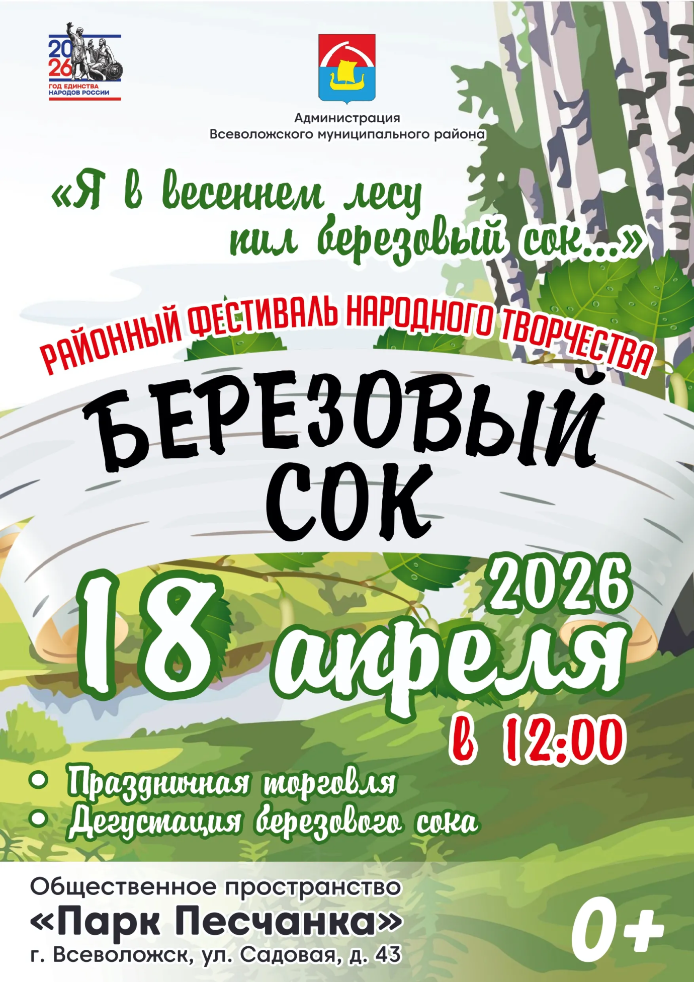 18 апреля 2026 года г. Всеволожск пройдет Фестиваль «Берёзовый сок» с участием коллективов Всеволожского района.