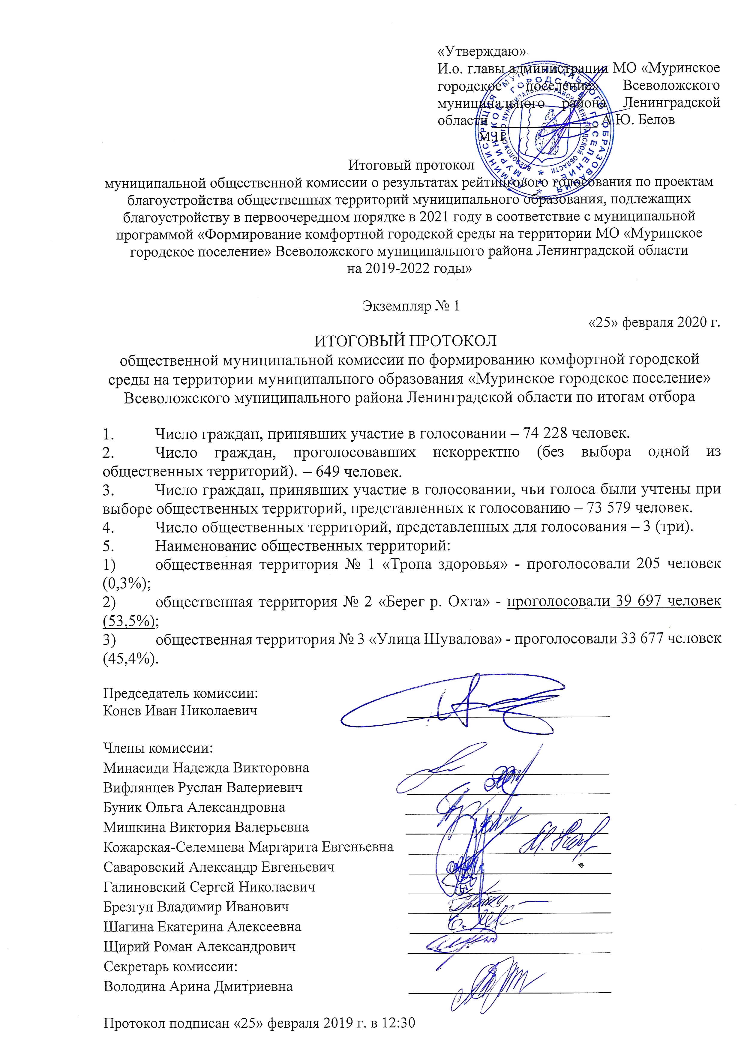 ИТОГОВЫЙ ПРОТОКОЛ муниципальной общественной комиссии о результатах рейтингового голосования по проектам благоустройства общественных территорий муниципального образования, подлежащих благоустройству в первоочередном порядке в 2021 году в соответствии с муниципальной программой «Формирование комфортной городской среды на территории МО «Муринское сельское поселение» Всеволожского муниципального района Ленинградской области на 2019-2022 годы»