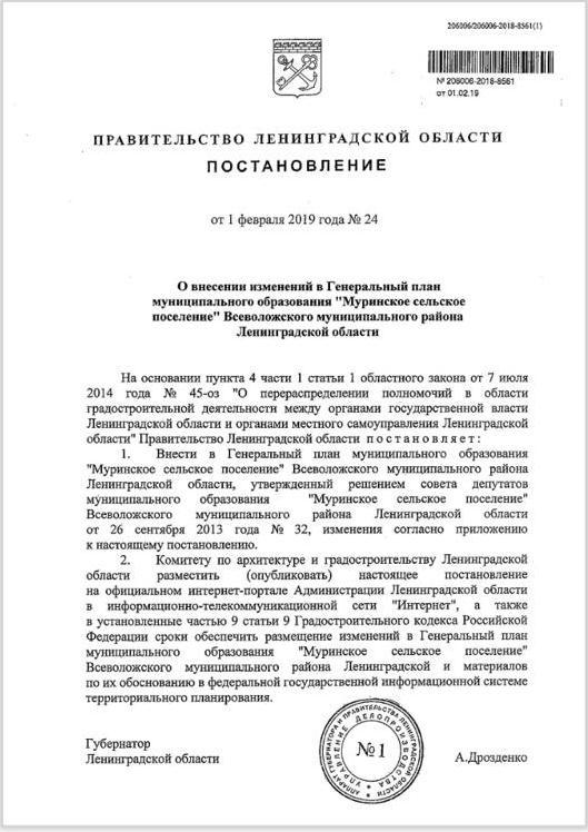 ПОСТАНОВЛЕНИЕ Правительства Ленинградской области от 01.02.2019 года №24 "О внесении изменений в Генеральный план муниципального образования "Муринское городское поселение