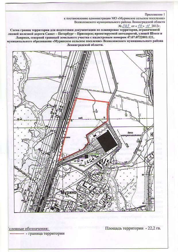 Приложение №1 "Схема границ территории для подготовки документации по планировке территории, ограниченной линией железной дороги Санкт-Петербург-Приозерск, проектируемой автодорогой, улицей Шоссе в Лаврики, северной границей земельного участка с кадастровым номером 47:07:0722001:121, МО "Муринское сельское поселение" ВМР ЛО.