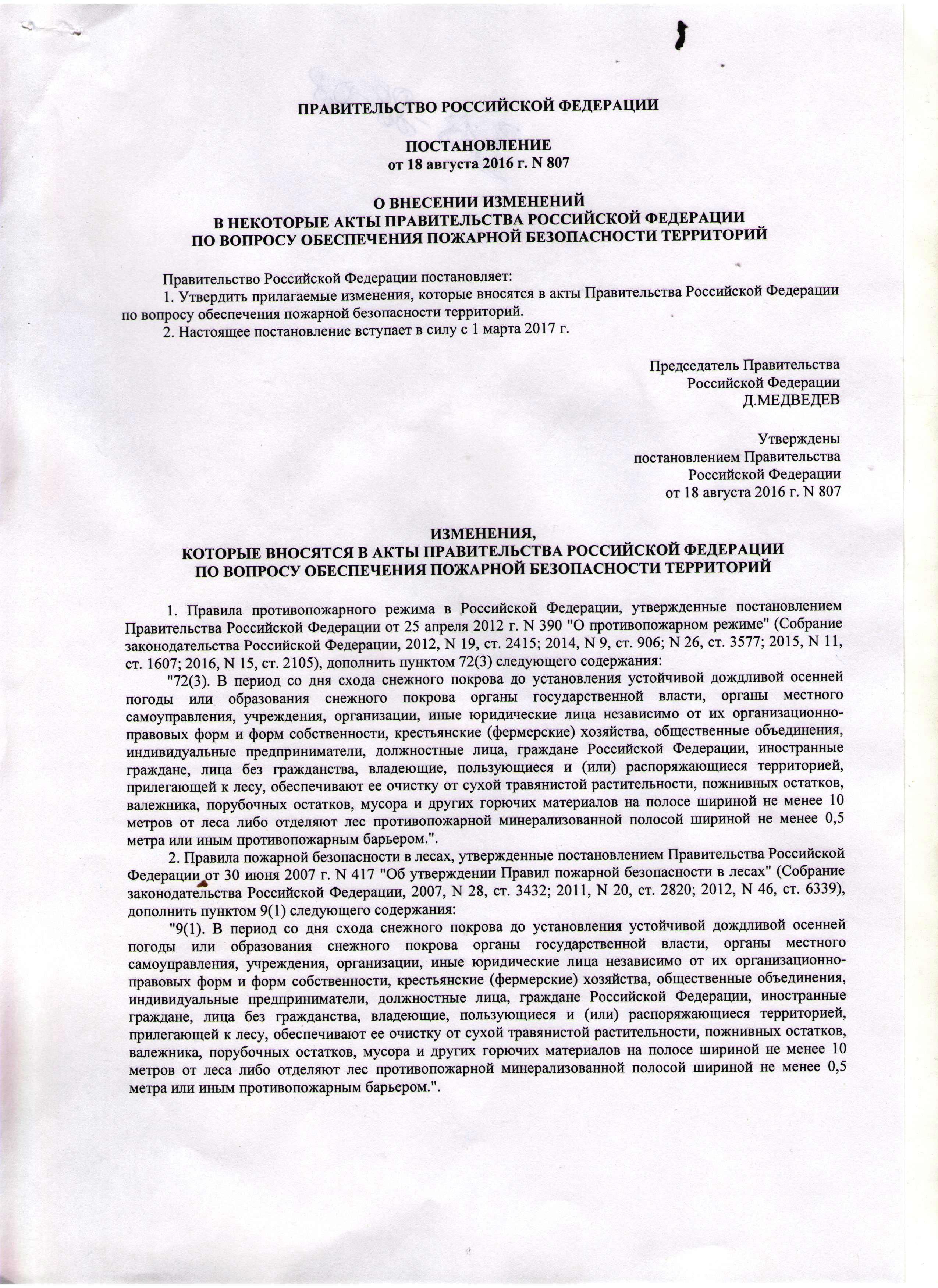 ПОСТАНОВЛЕНИЕ ПРАВИТЕЛЬСТВА РФ от 18.08.2016г. №807 "О внесении изменений в некоторые акты Правительства Российской Федерации по вопросу обеспечения пожарной безопасности территорий"